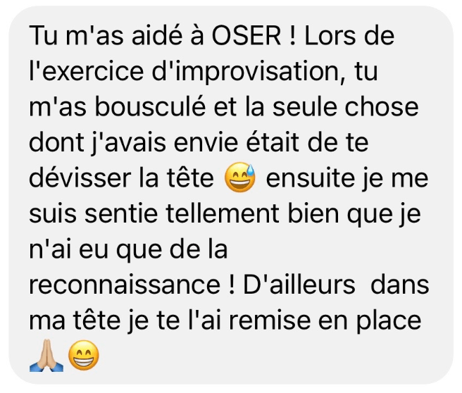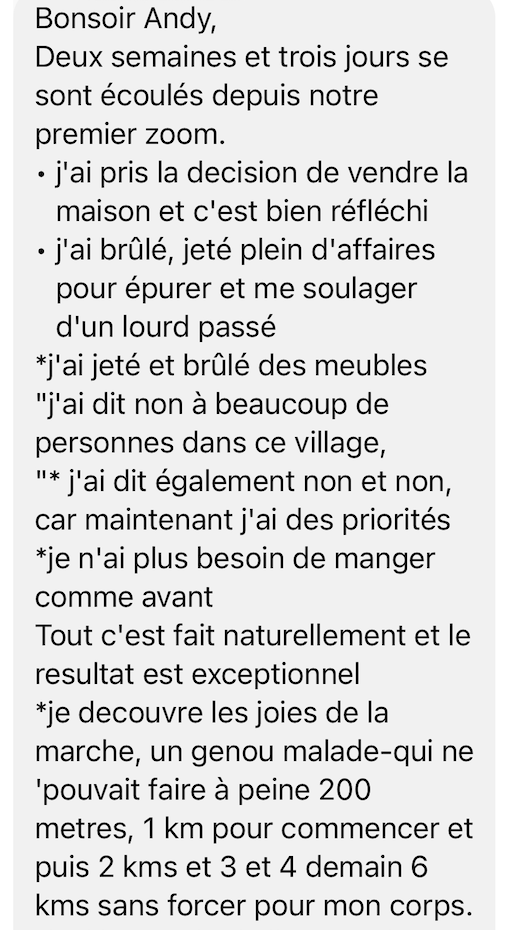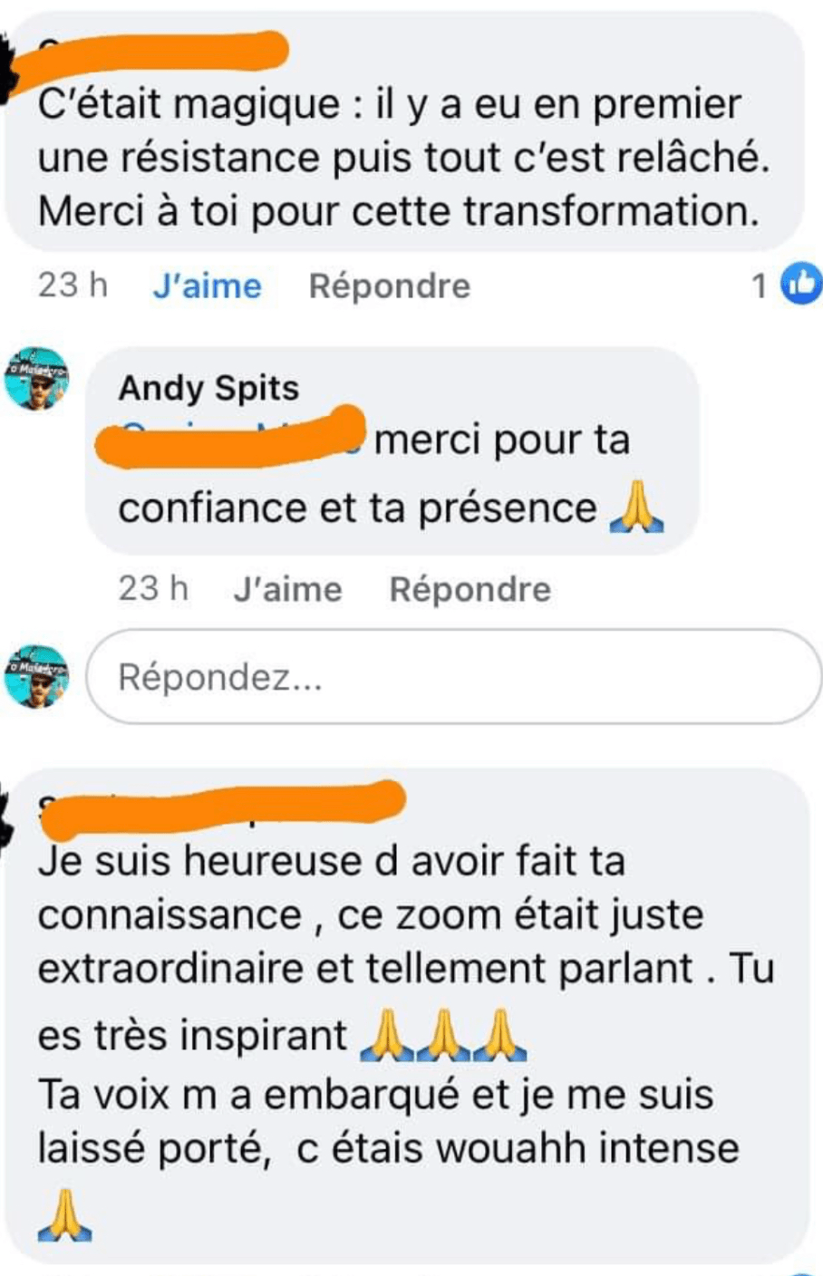ANDY! Tu m'as aidée à OSER! Lorsque j'ai un coup de mou, je me remémore ton fameux coaching qui a changé toutes mes perceptions, qui m'a fait me recentrer sur moi-même et le plus important: à m'apprécier en tant que personne. À me dire que: qu'importe ce qu'il se passe, je peux y arriver, je peux m'en sortir et je suis une personne valable avec du potentiel.